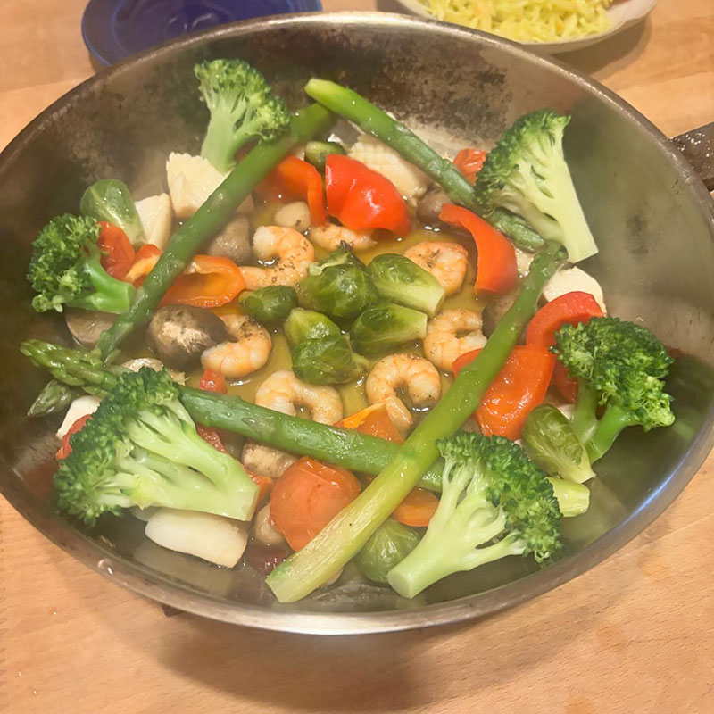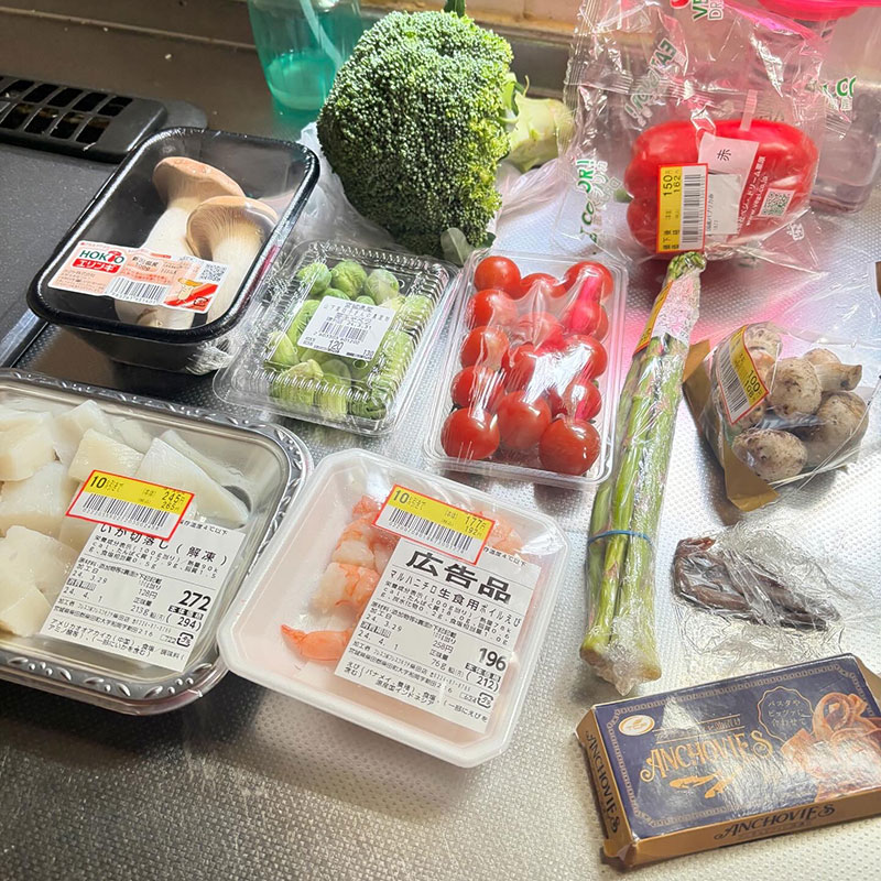 芽キャベツ、アスパラガス、パプリカ、エビ、イカ、マッシュルーム、エリンギ、ミニトマト、ブロッコリー。