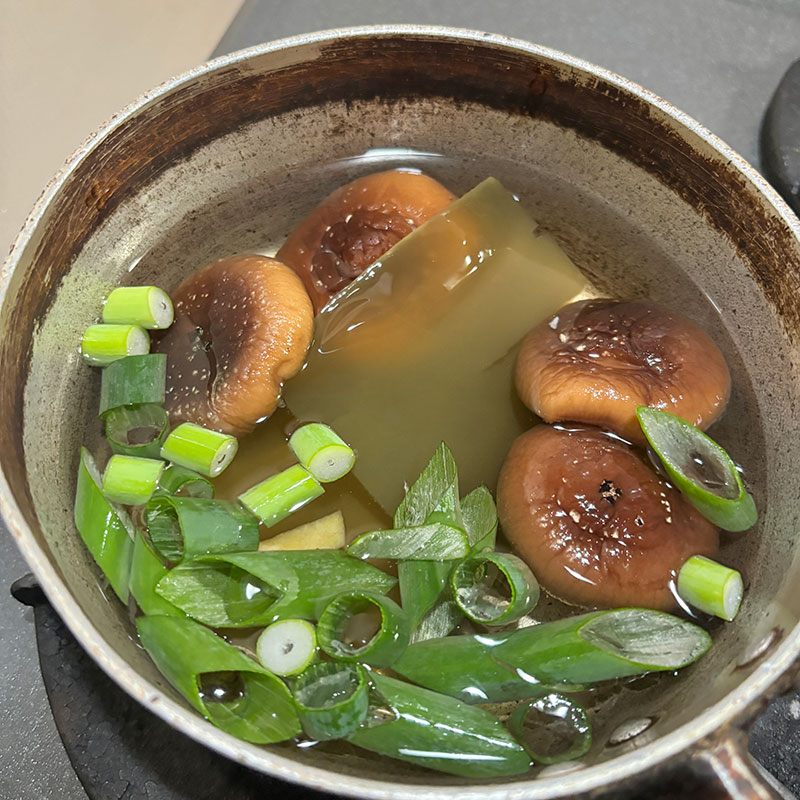 昼に鍋の水に昆布と自家製干し椎茸を浸しておいた。