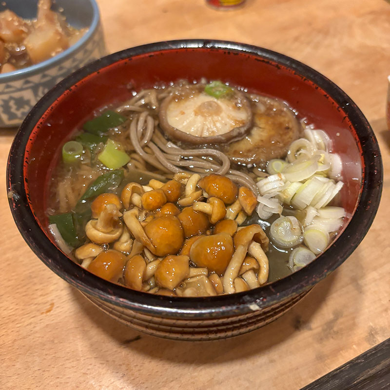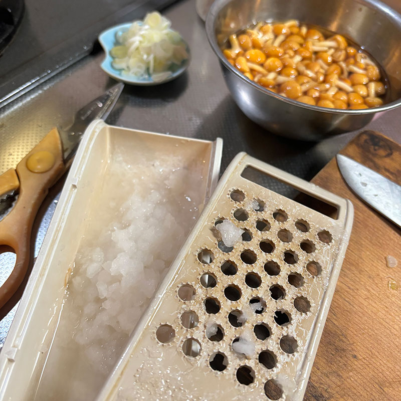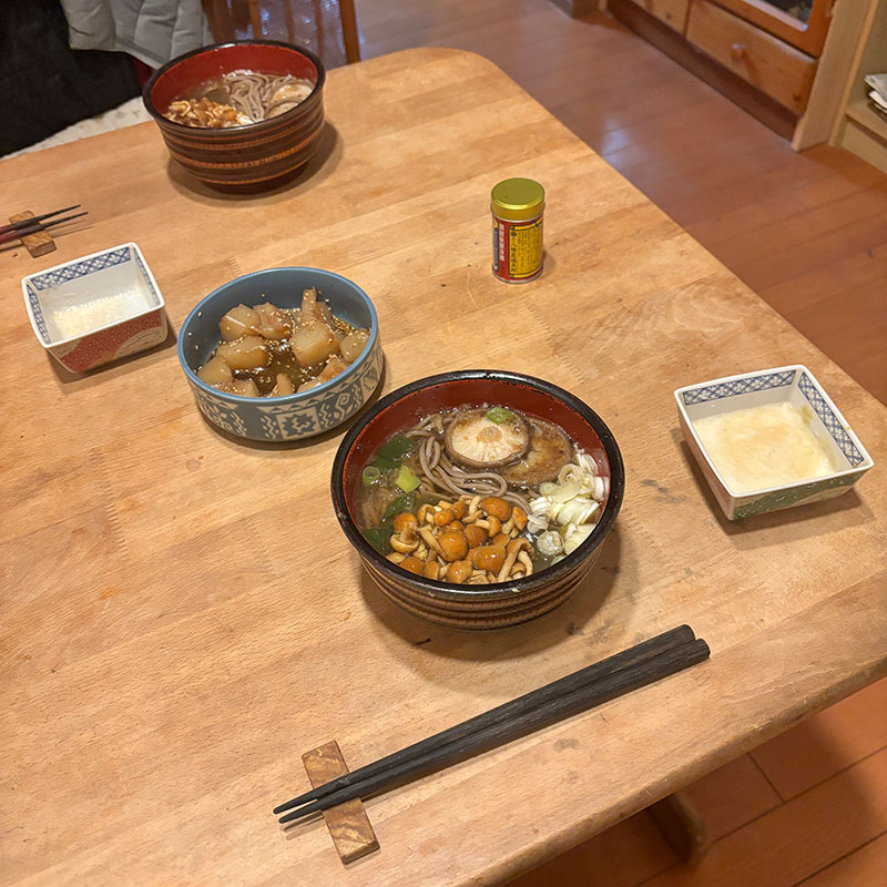 長ネギとなめこをトッピング。いただいた岩手名物、土川そばを茹でて。蕎麦と相性の良い山芋をおろして。