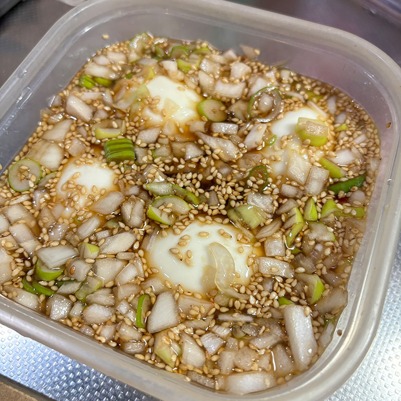 今回の漬けダレは麺つゆ、水、長ネギ、玉ねぎ、白胡麻、赤唐辛子、ごま油、蜂蜜。