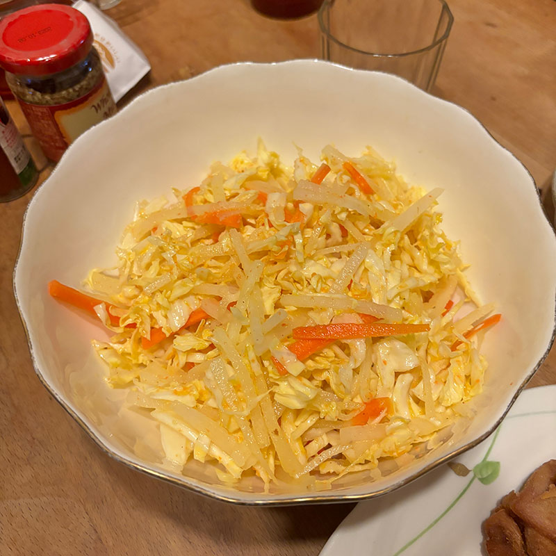 大根とキャベツとにんじんをハンドブレンダーで作って常備してるにんたまドレッシングで和えたサラダ。
