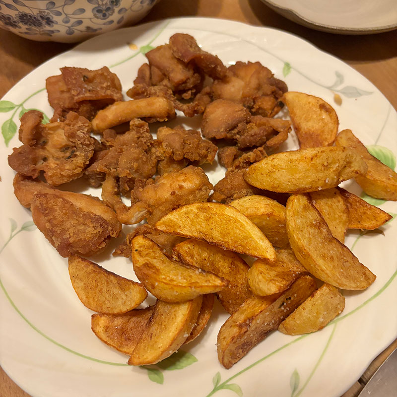 カミさんが自家製ニラ醤油と生姜で味付けした鳥の唐揚げ作ってくれた。ついでに揚げてくれたフライドポテト。