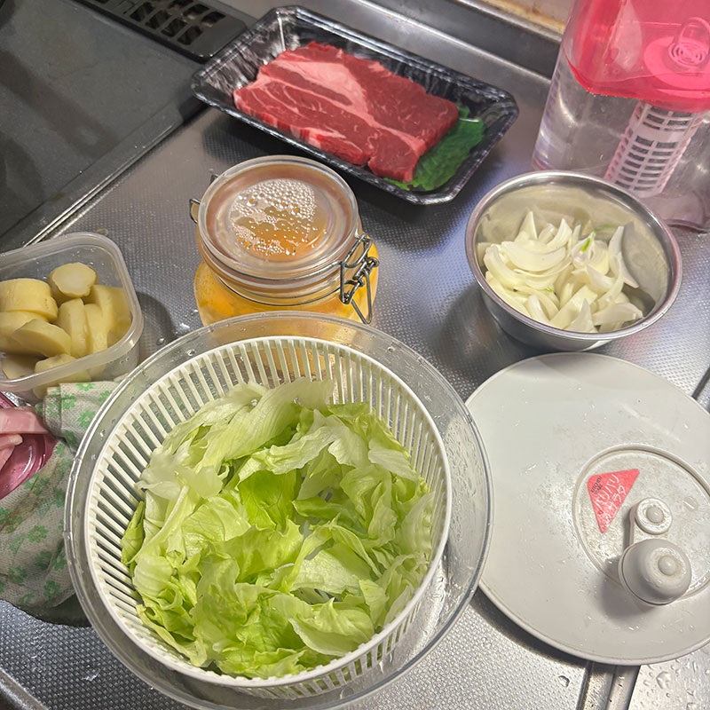 水から低温で茹でて冷蔵庫で一日熟成させておいたメークインと新玉ねぎで