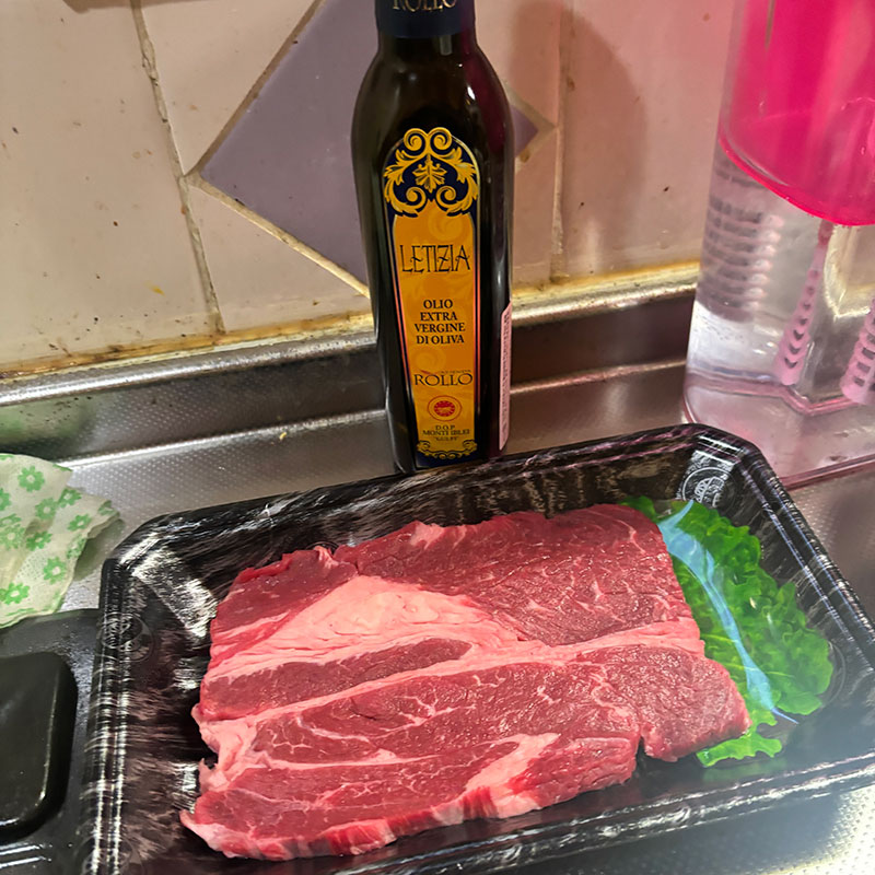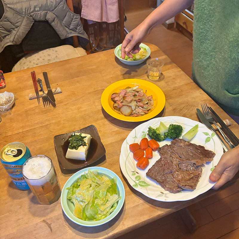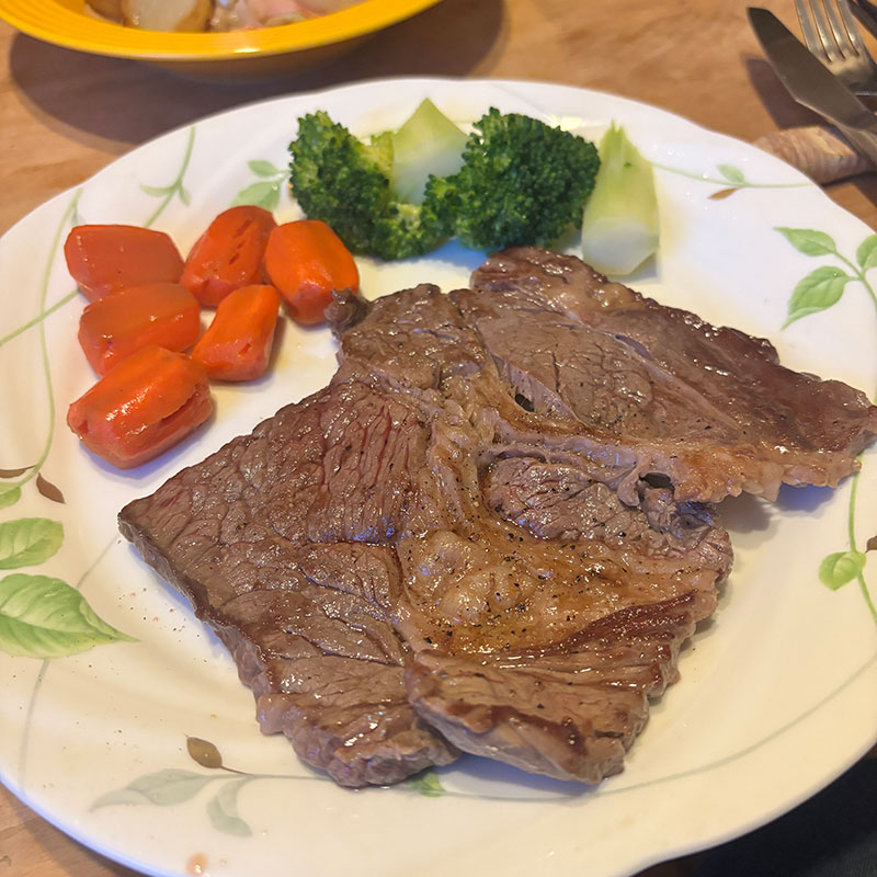病み上がりのカミさんには自分用に買ってきたステーキ肉一枚を焼いてもらう。