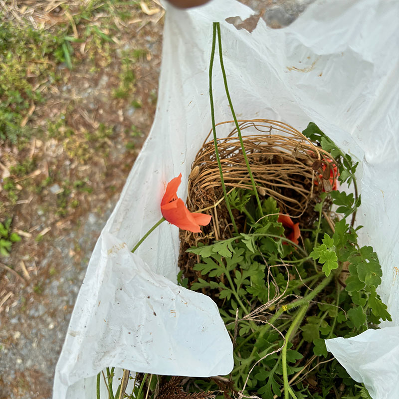 グローブして根っこから抜いて用意してあるビニール袋に入れた。繁殖力が異常に高く在来種を駆逐するケシ科の外来種。1つの実から1,600の種が取れ、1つの個体が100個の実をつけるので15万の種が周囲にこぼれ落ちる。でも見た目がかわいいから、気がつかないうちに繁殖してしまった、というより抜かないで育ててるんじゃ無いの?って家ばかりになってきた。