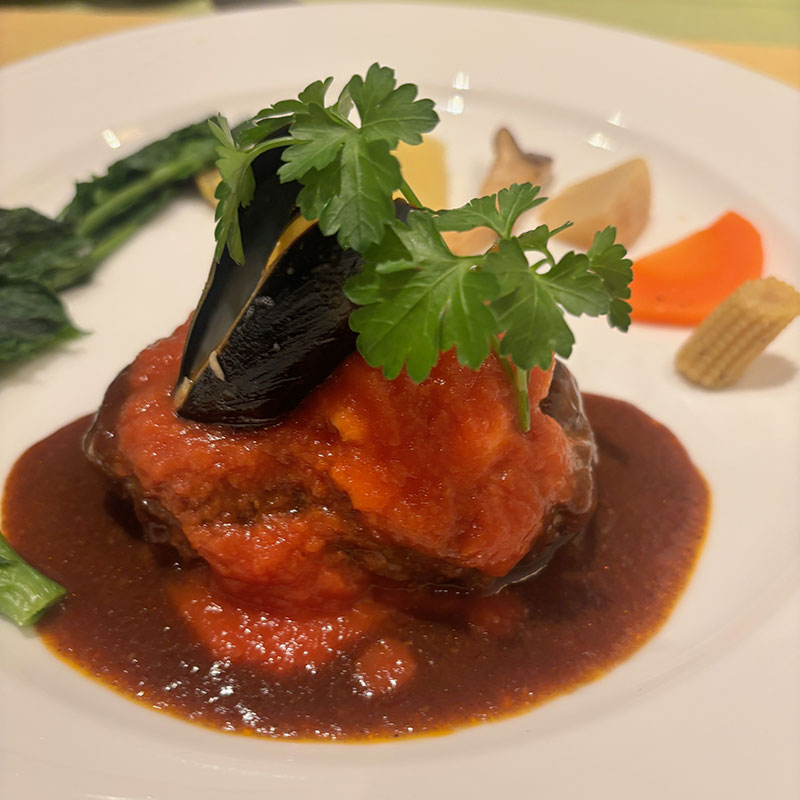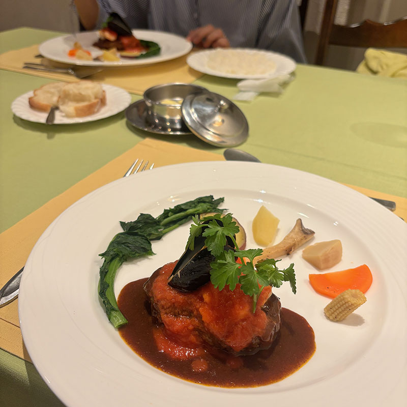 ルガノ風ハンバーグステーキ頼んだ。ムール貝やエビが乗ってる。僕が頼んだパンもカミさんのライスも美味しかった。