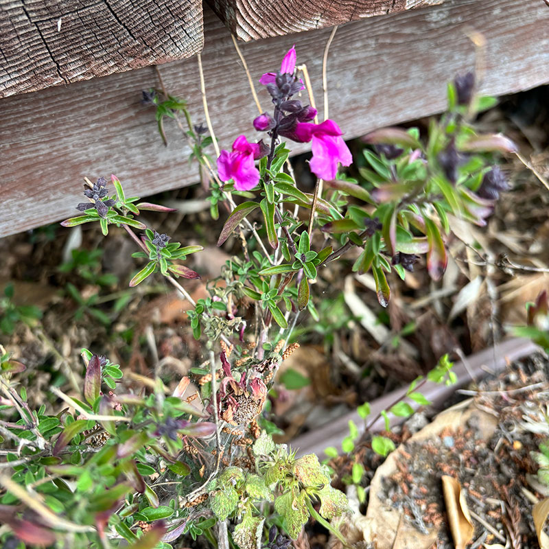 露地からプランターに移植したチェリーセージも赤紫の花をつけ始めた。