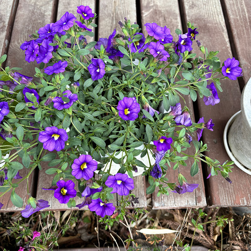 カミさんがもらったカリブラコアの鉢。うまく育てると秋まで花が咲くという。