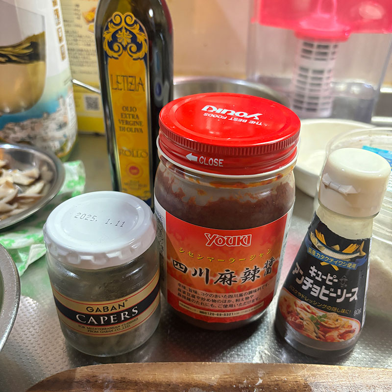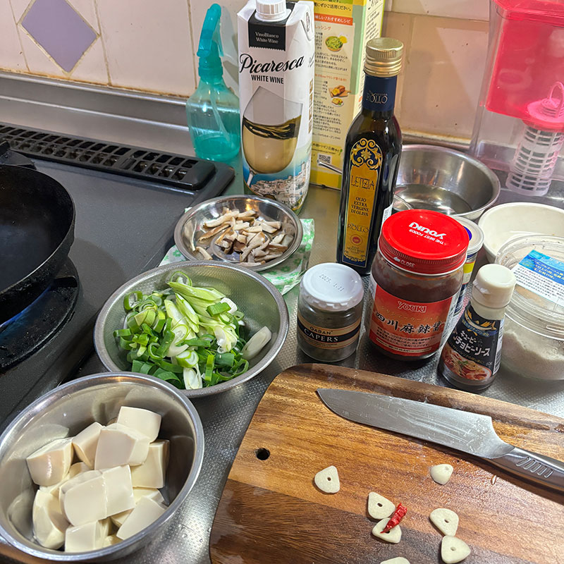 白い麻婆豆腐といっても四川麻辣醤は使うけど後はアンチョビやケイパー、白ワインなどで味付けするので