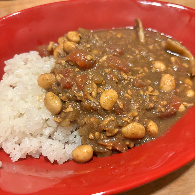 カミさん、夕食のスパイスカレーに五目豆入れてた・笑