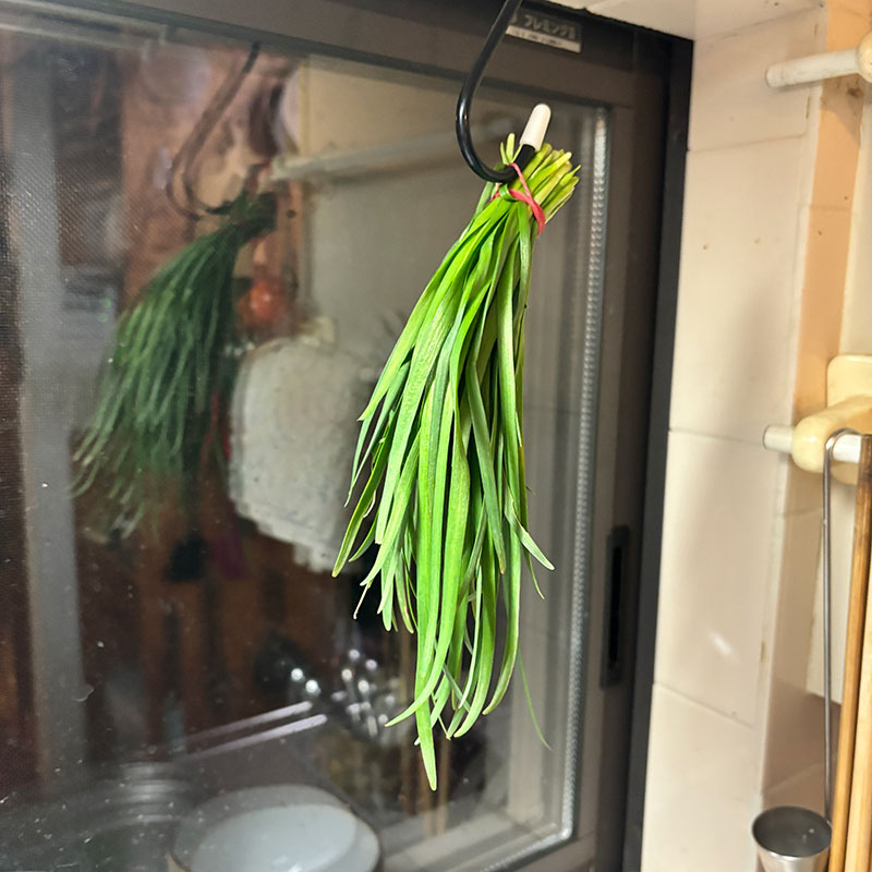 いただいたニラと長ネギ。玉ねぎ。冷蔵庫にあった紅生姜。赤唐辛子と白胡麻。