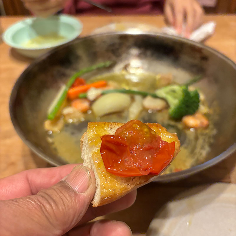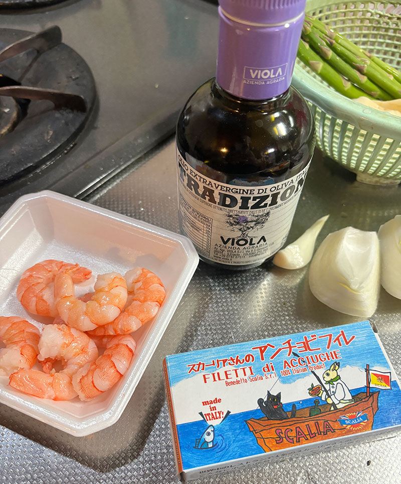 またアヒージョ。僕らふたりとも大好きすぎる。にんにくとアンチョビと幼馴染みの @shoe.education さんにもらった美味しいイタリアのオリーブオイルで