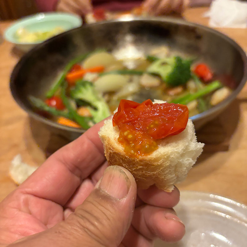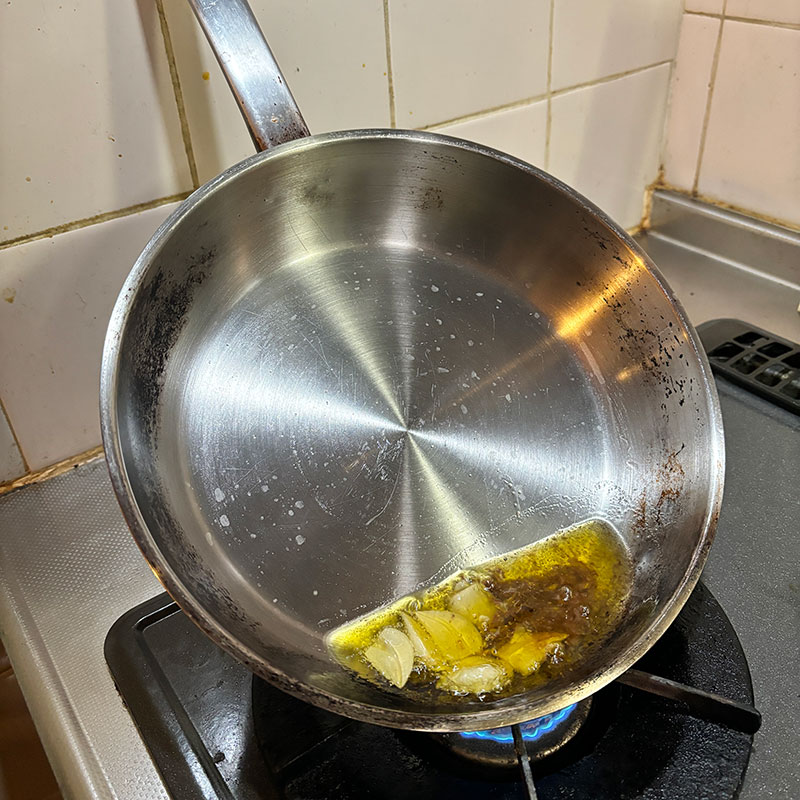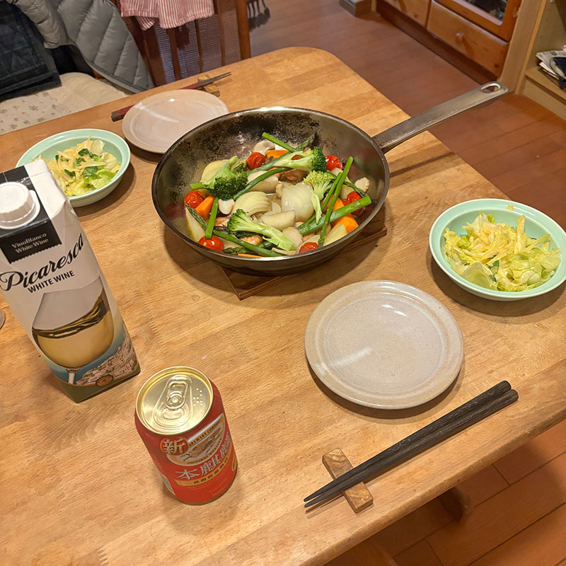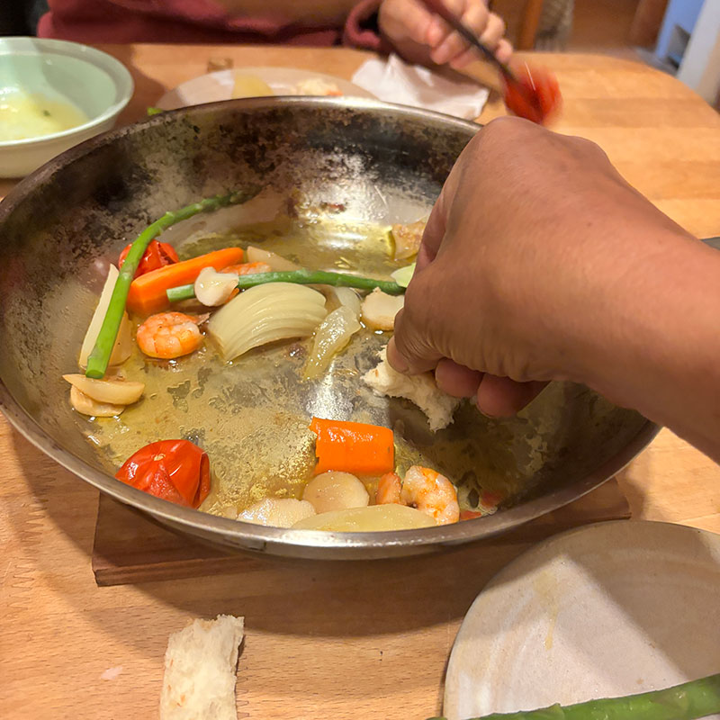 アヒージョって約12分火を入れている間に洗い物と片付け終わるし、食べ終わったらフライパンと取皿洗えば片付け終了なのも嬉しい。