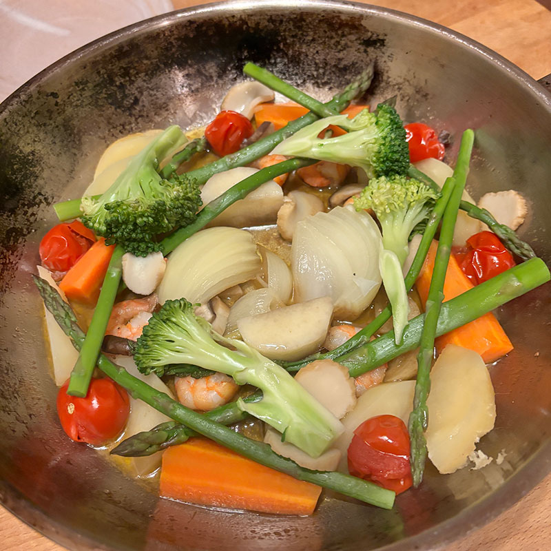 今宵は友だちにいただいたアスパラガス。にんじん、じゃがいも、玉ねぎ、海老、エリンギ、ブロッコリー、ミニトマト。