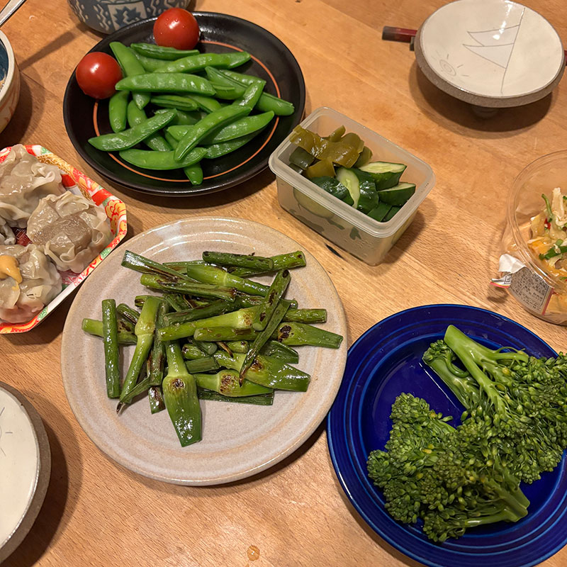 夕食に早速にんにくの芽を炒めて。ブロッコリーとスナップえんどうは茹でていただいた。近所の方にいただく野菜でメニューが決まる季節だ(笑)(感謝)