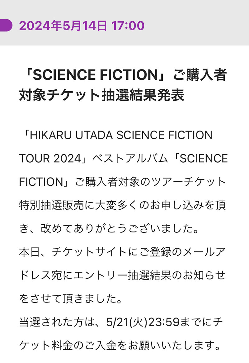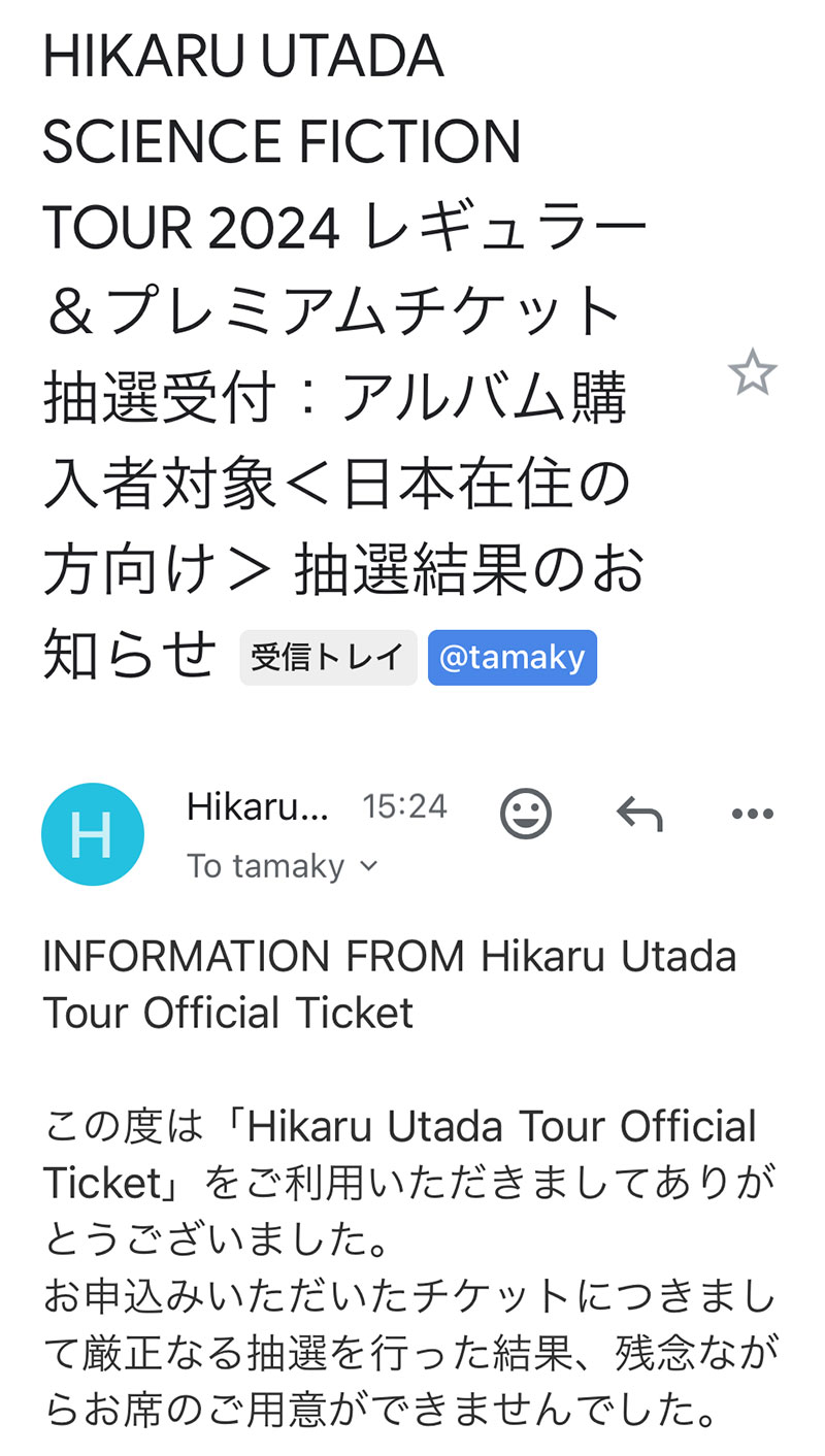 仙台公演に応募したけど外れた。コンサートあまりしないから倍率すごかっただろう。残念。