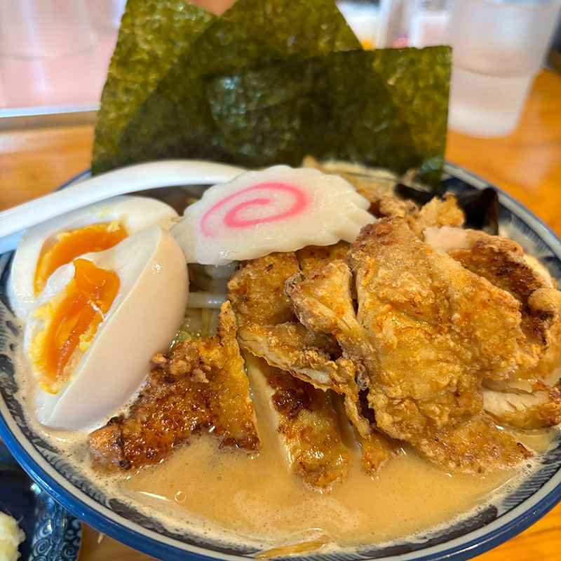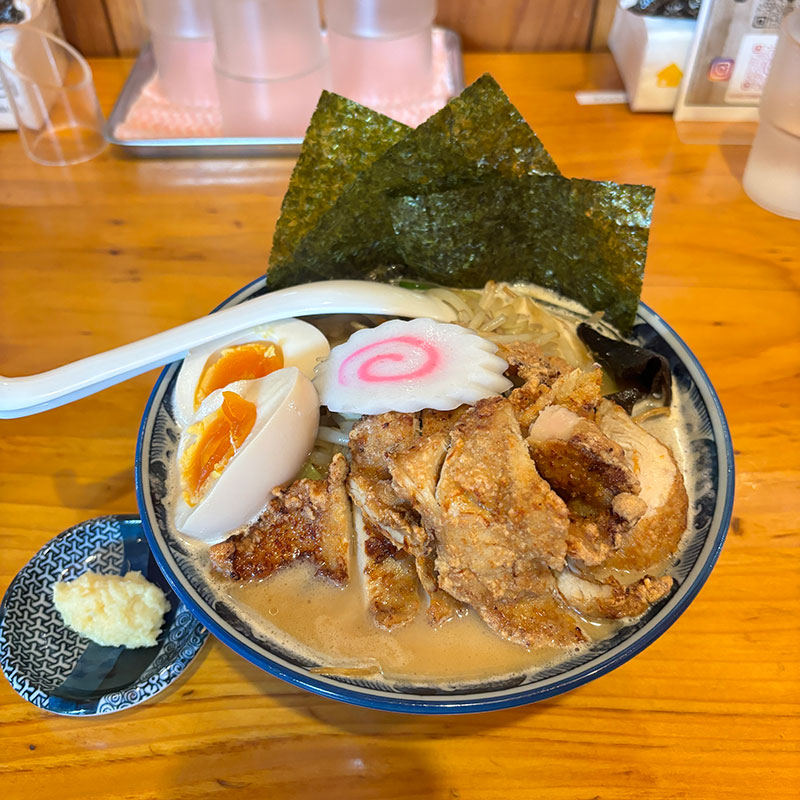 来た時気になっていた五香粉香る台湾風唐揚げ、鶏拝(ジーパイ)の乗った、特製濃厚タンメン 1150円を注文。太麺のまま。おろししょうがトッピング(無料)。