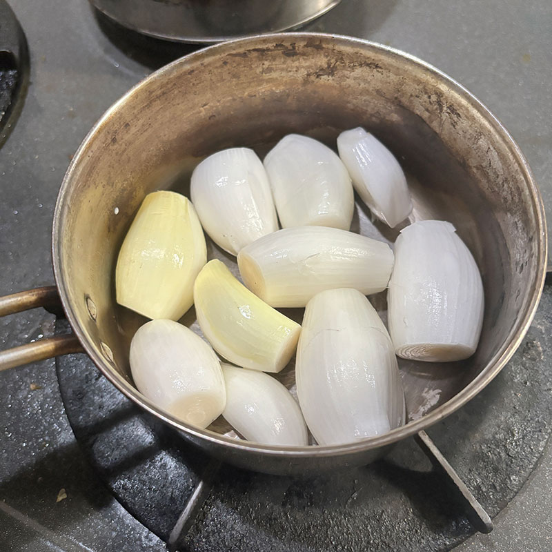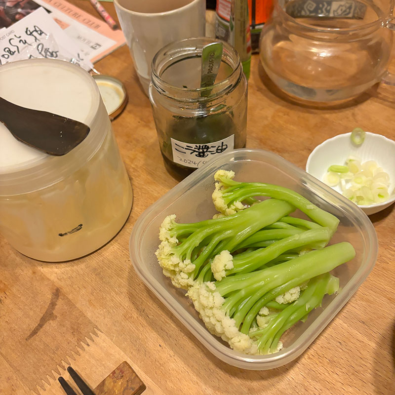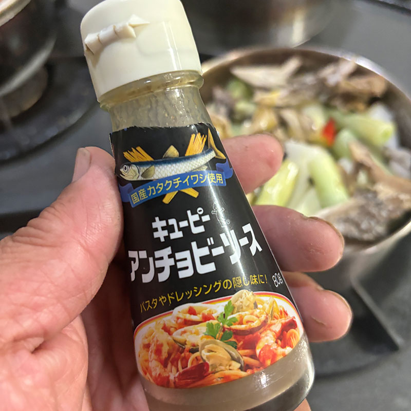 アンチョビで味付け。風味付けににんにく、ケイパー、黒粒胡椒、鷹の爪。