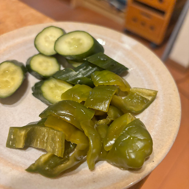 ぬか漬けはきゅうりとピーマン。教え子のインスタ見て真似してみた。初めてだけど美味しい。夏に畑で同じ時に大量に収穫して困ることがある。夏のぬか漬けの定番になりそう。