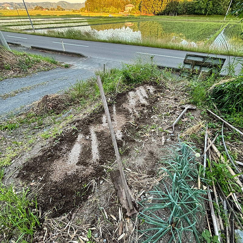 そーとー遅れてる畑の準備。苦土石灰と肥料まいて鍬ですき込んでおく。ここには今日近所の方にもらった茄子の苗を植えるつもり。
