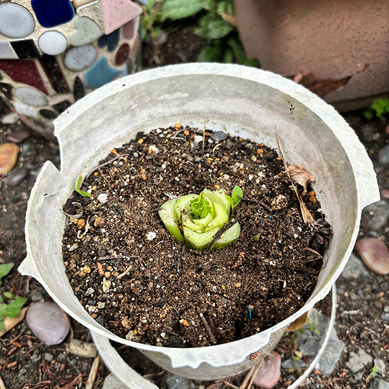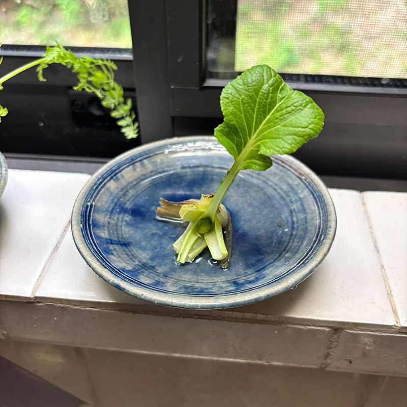 食べた後の小松菜の根をキッチンガーデンの皿に置いたらすぐに新しい葉が出た。