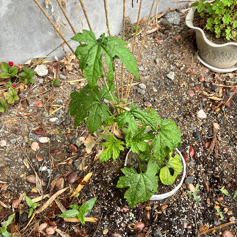 5日前に本葉6枚で摘芯したゴーヤ。順調に本場が育って蔓が2階から垂らしてる麻紐に絡みつきだした。