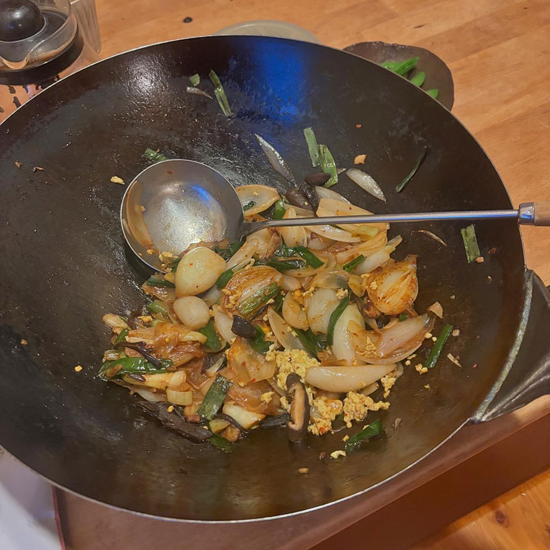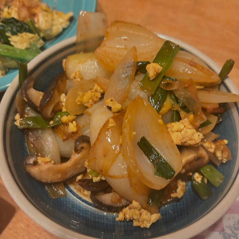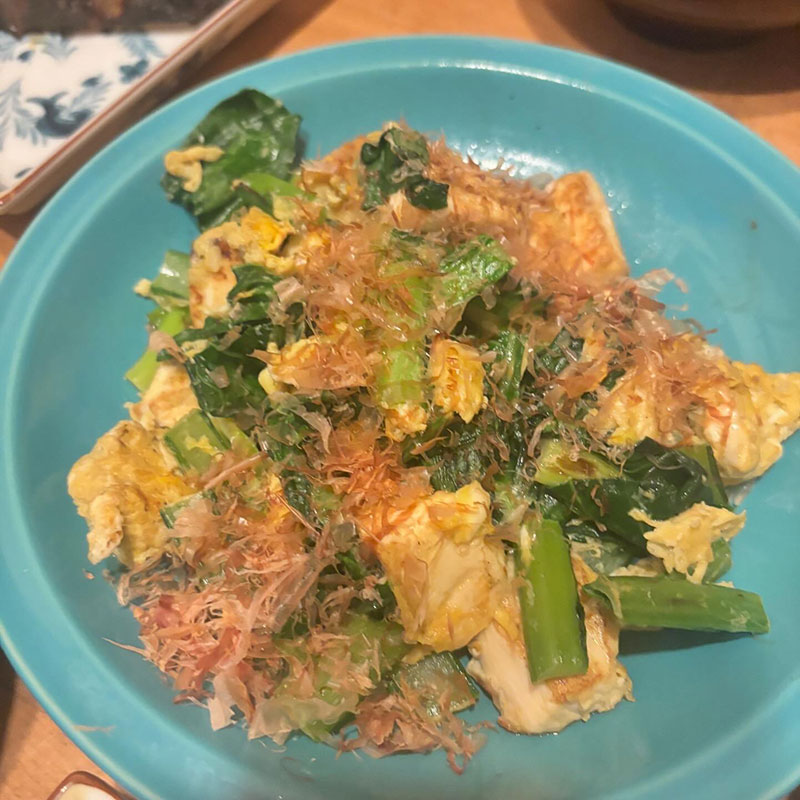 カミさんは小松菜を豆腐と卵と炒めてチャンプルーにしてくれた。