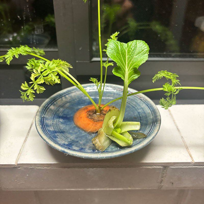 キッチンガーデン。小松菜あっという間に葉が出た。畑に植えればまた食べられるらしいよ。