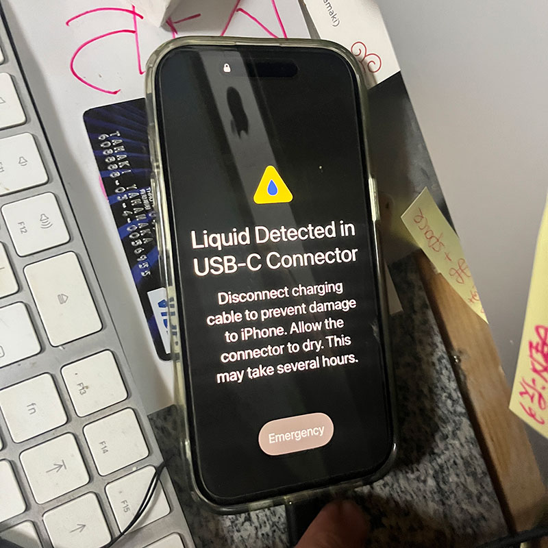 iPhoneをiMacに繋いだら見たこともない警告と警告音!もしかしてMacがハッキングされててiPhoneもやられるのか?!と焦ったけどこれはUSBコネクタに液体が入っているという警告だった。風呂に入る時いつも防水防塵のiPhone15を持って入るのだけど実は今日、風呂から上がる時に湯船に落としてしまった!速攻で取り出してタオルで拭いたら通常通り作動してほっと胸を撫で下ろしていたのだけど。まさかコネクタが濡れていたとは。乾燥させて無事、接続させる事が出来ました。もし同じような事に遭遇したら焦ってドライヤーで乾かすとかコネクタに布を突っ込んで乾かそうとしない方が良いですよ。壊れる。