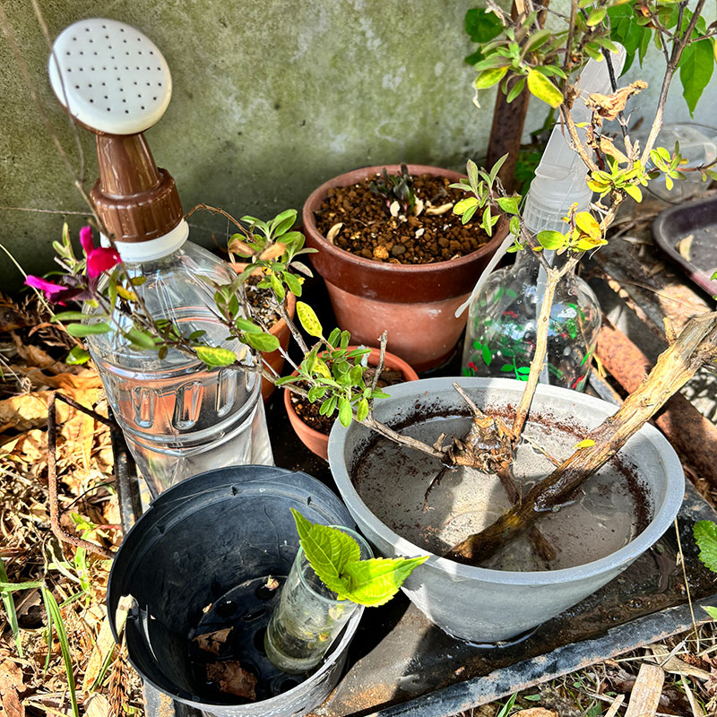 少し日陰で水に浸けて根出しをしてる紫陽花とチェリーセージ