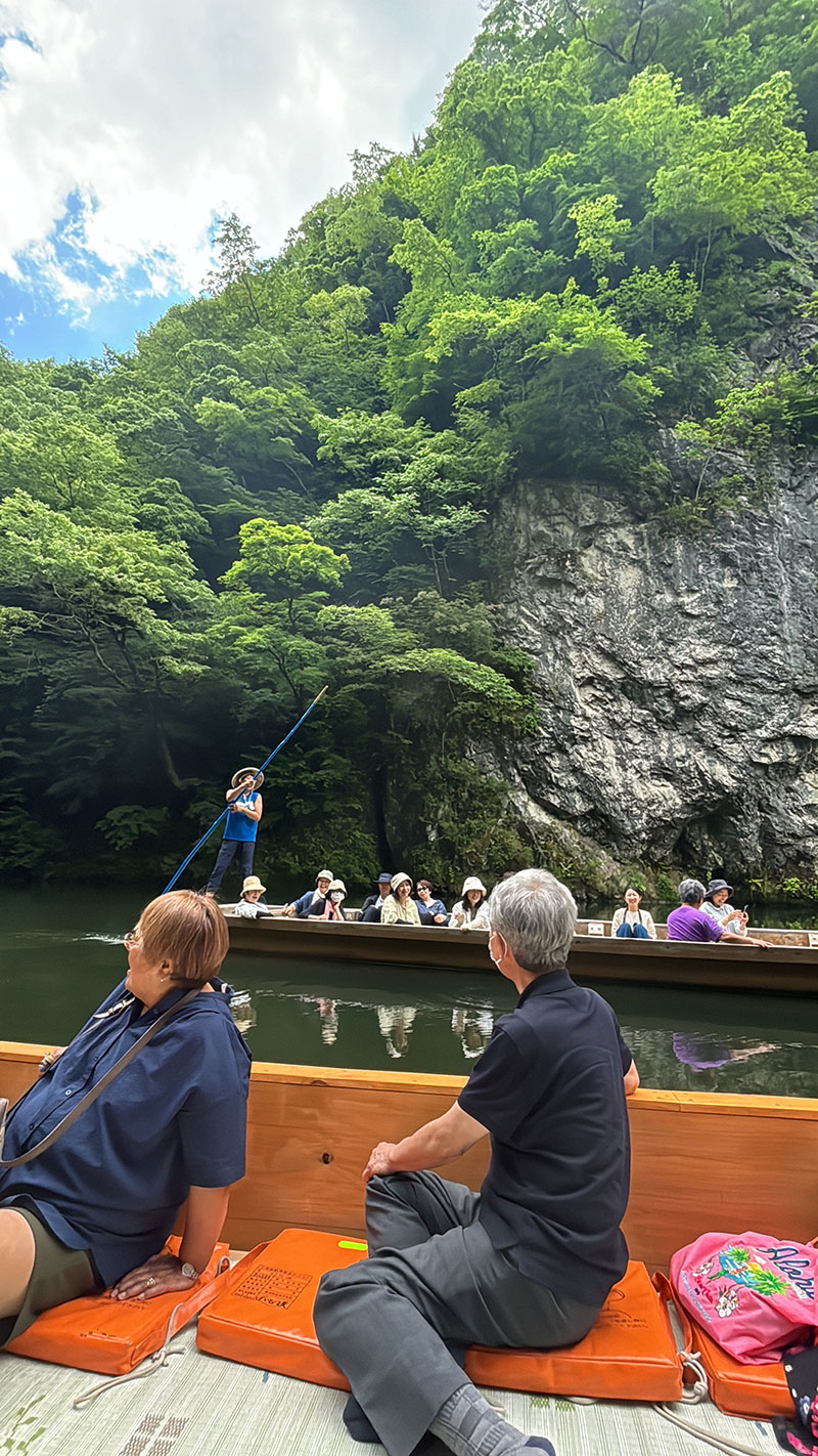 この川下り船が低くて更に椅子では無くて座布団に座るので低くて水面がすぐ。
