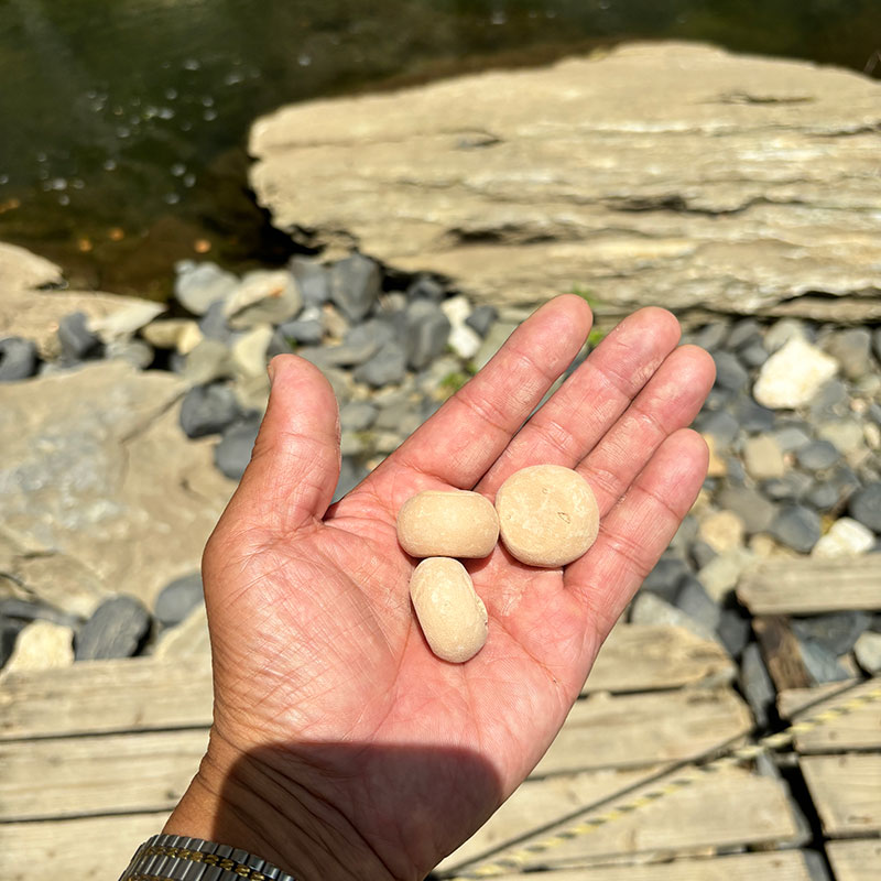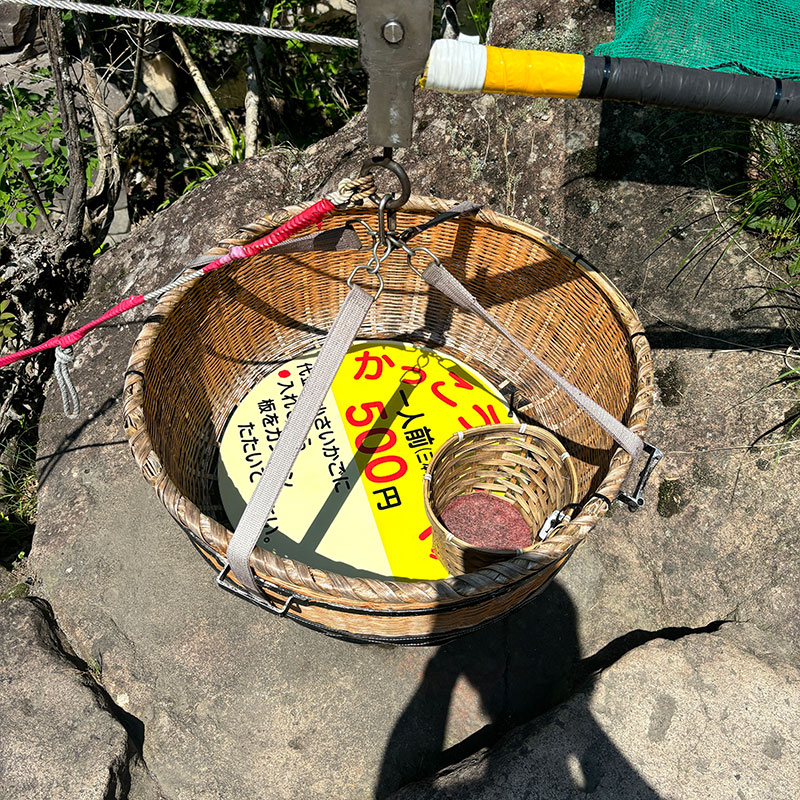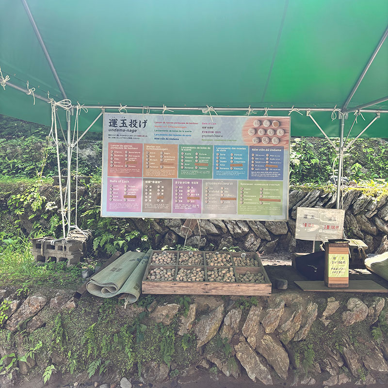 対岸の岩の壁の穴に見事投げ入れると言葉が叶う、