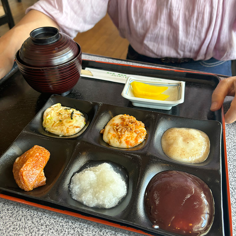 道の駅 厳美渓の食事処はレストランペッタンくんという店名。変なの、と思っていたら一関は昔から何かあるとすぐにお餅をついてお供えしたのだそうだ。餅つきのぺったんからきてる通りメイン料理は餅。餅好きのカミさんいろんな餅が少しずつの定食で大喜び。