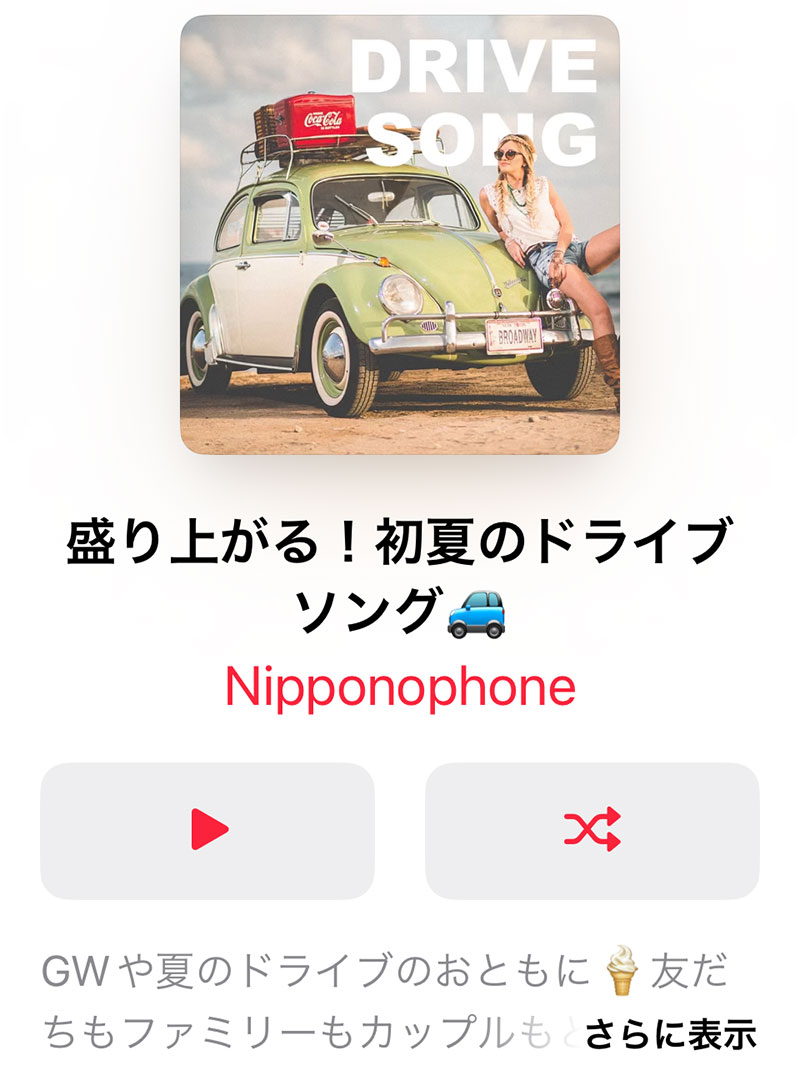 昨日からのドライブ中はカーステレオにiPhoneのapple music の「盛り上がる!初夏のドライブソング」をBluetoothで飛ばしてずっとかけていた。最新のヒット曲から懐かしすぎる東京ブギウギまで。ロックやポップス以外に演歌までかかって楽しめた。こんなプレイリストが用意されてると思いがけない曲にも出会えて楽しい。