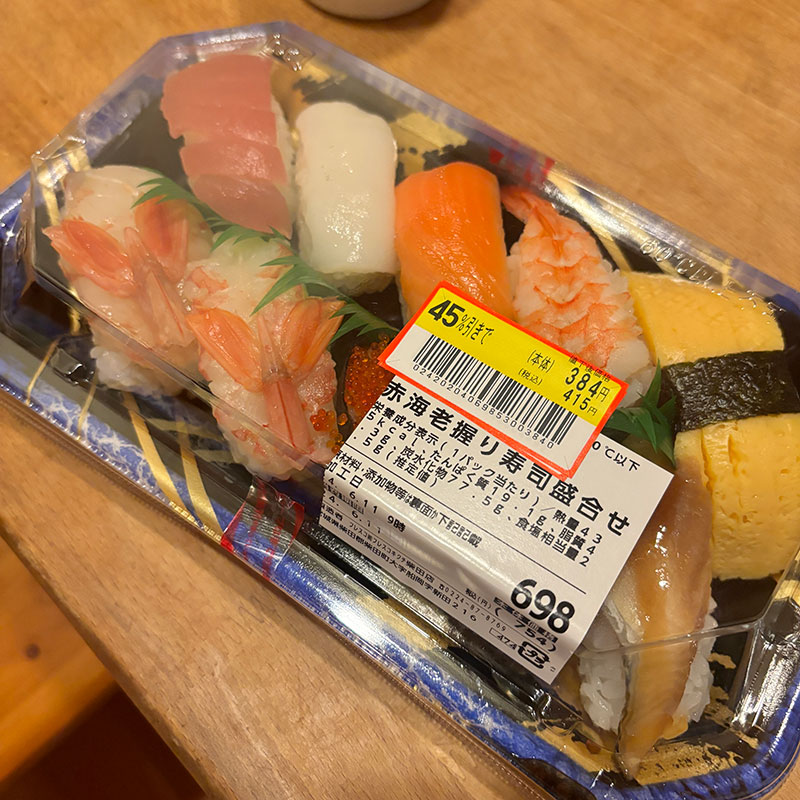 最後まで残って45%引になっていた寿司、最後のふたつ買って帰宅。