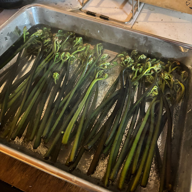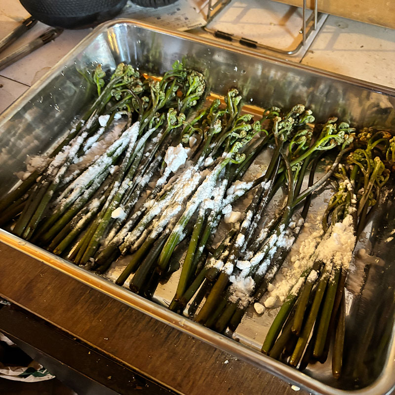 道の駅で買ってきたわらびに重曹振って熱湯かけておく。