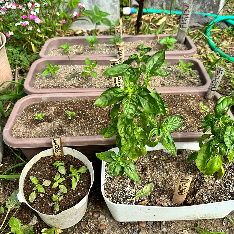 奥からブッシュバジル、レモンバジル、ホーリーバジル(オオヤトゥルシー)、スイートバジル。