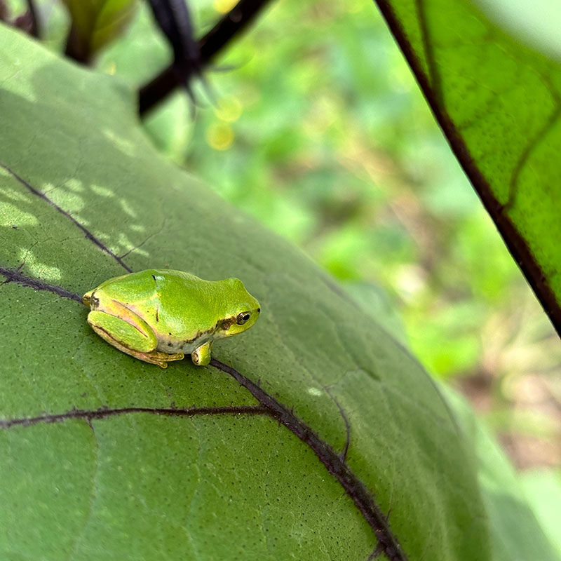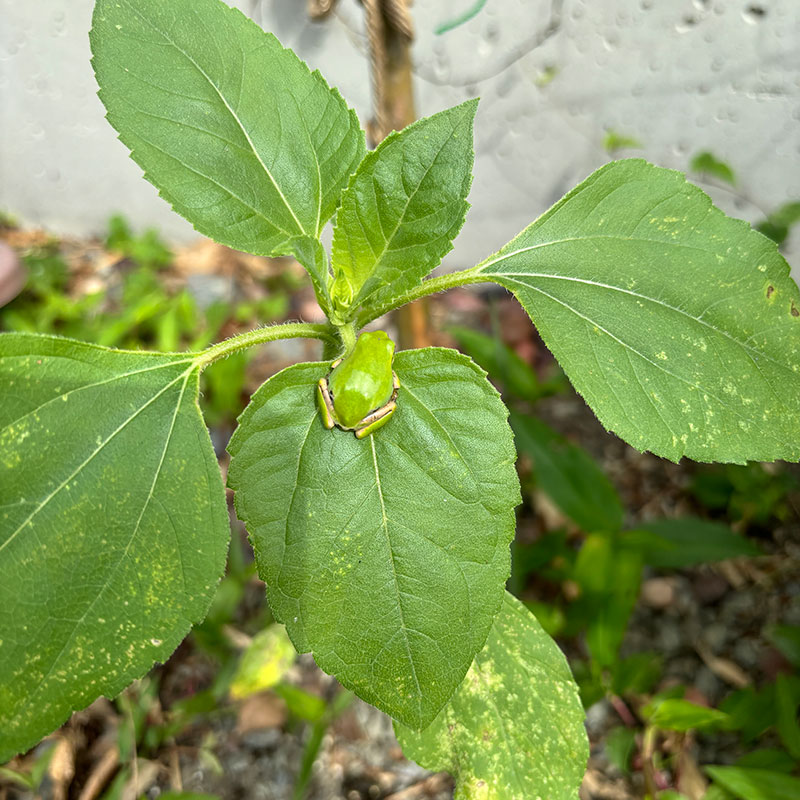 茄子にアマガエル。虫と違って葉っぱ食べたりしないからそのまま好きにさせておく。