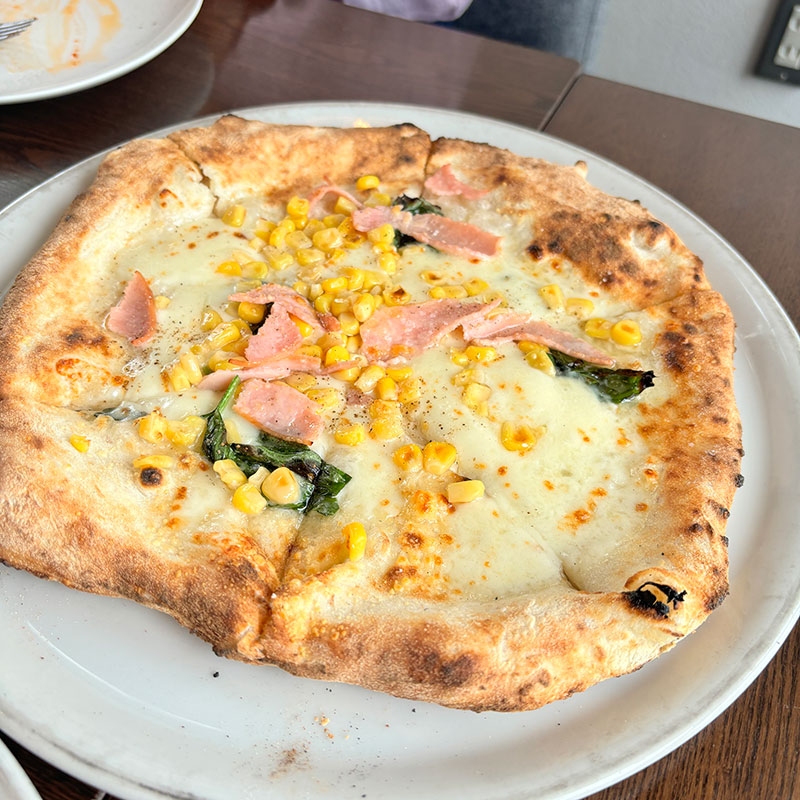 本日のピザはチーズベースのロースハムととうもろこしと黒胡椒のピザ。