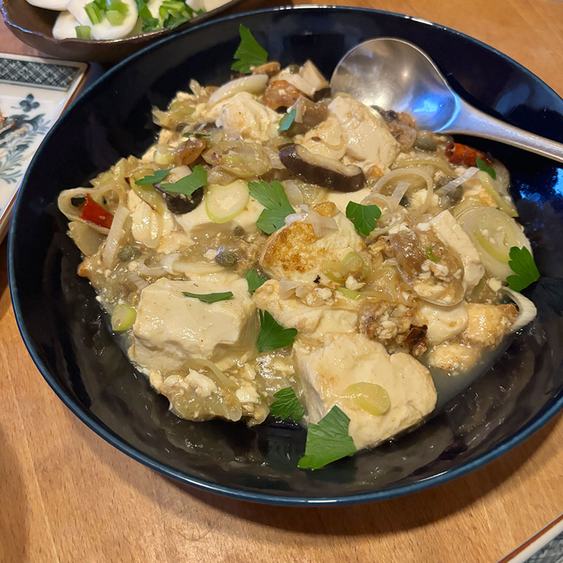 隠し味にケイパーと自家製柚子胡椒入れたらえっちゃんに言い当てられた。すご。