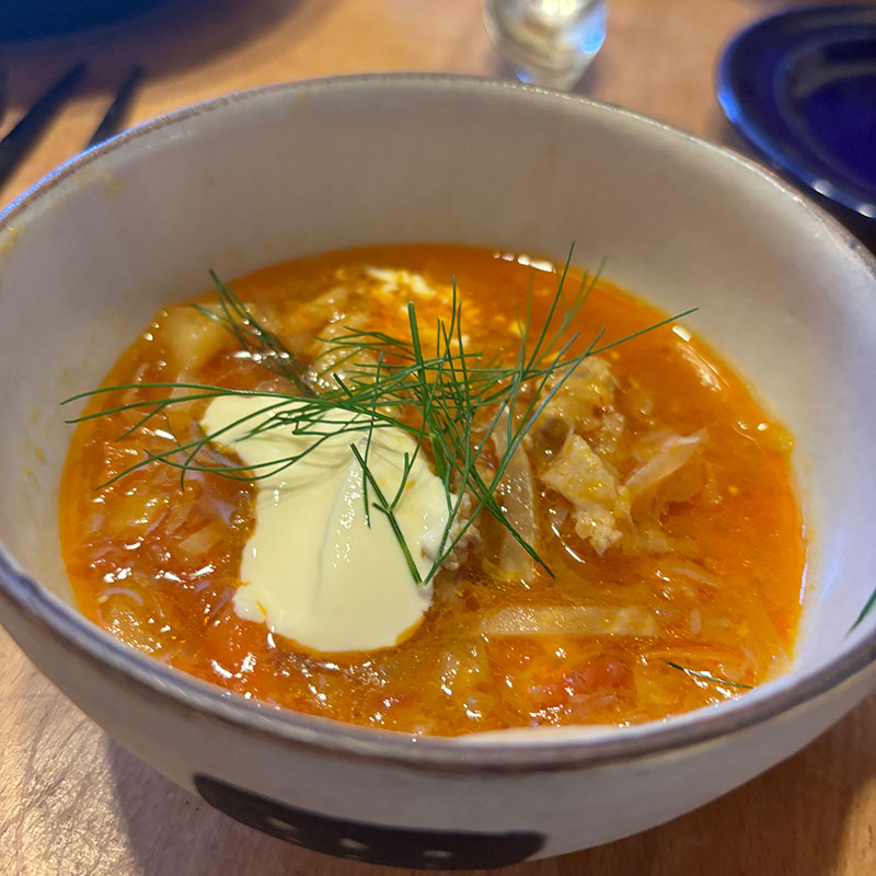 美味しいって言いまくってくれたボルシチを畑のディルとサワークリームで。