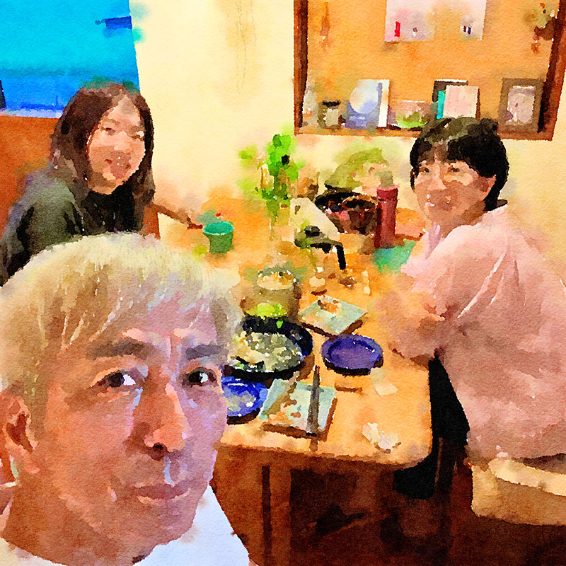 居酒屋我家、開店。最終一本前の新幹線で帰るえっちゃんと乾杯。ハンドルキーパーのカミさんごめん。