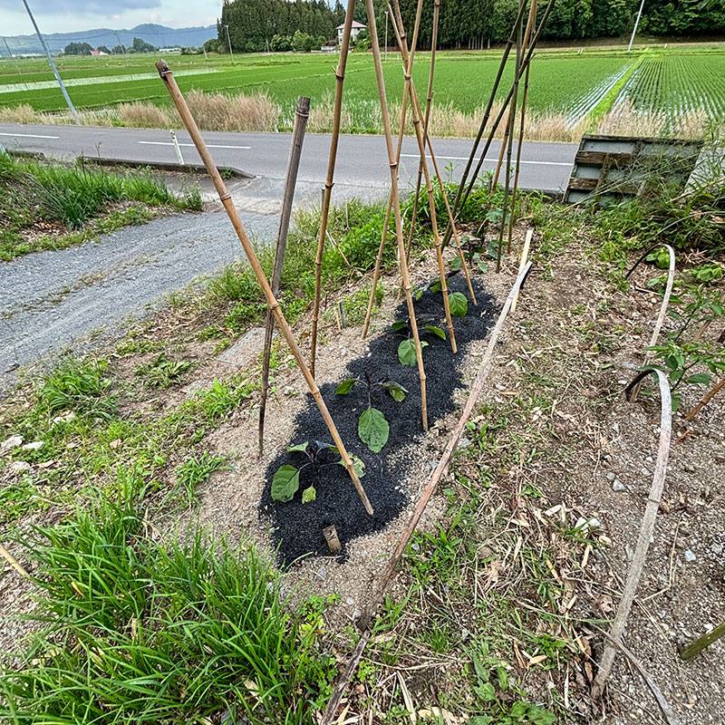 茄子の周りに燻炭を敷き詰める。土壌改良を兼ねて黒マルチの代わりに地温を上げる。(ビニール嫌いなので)