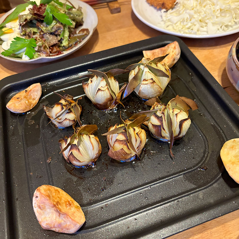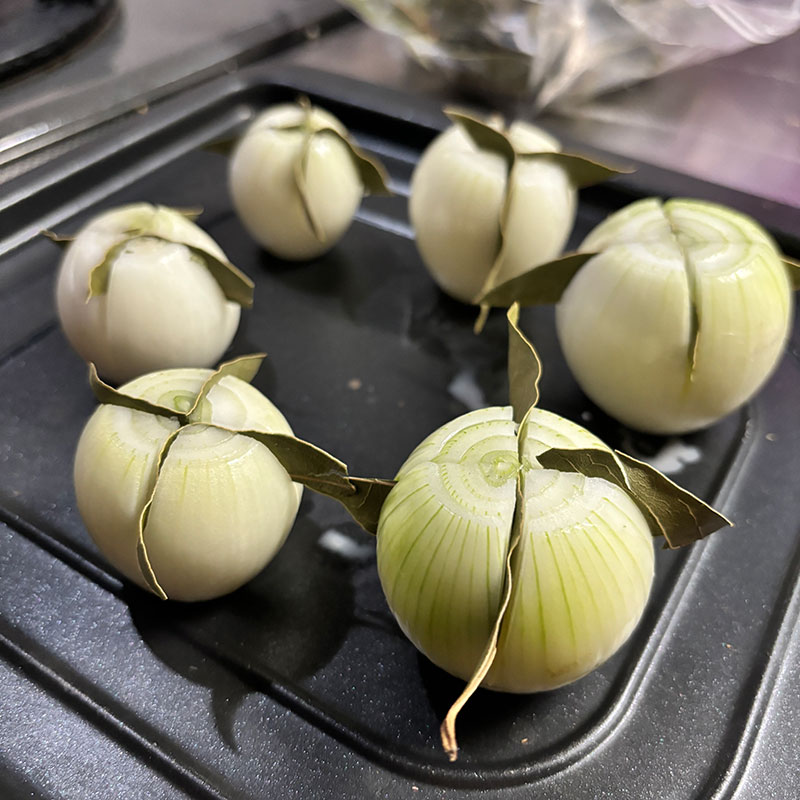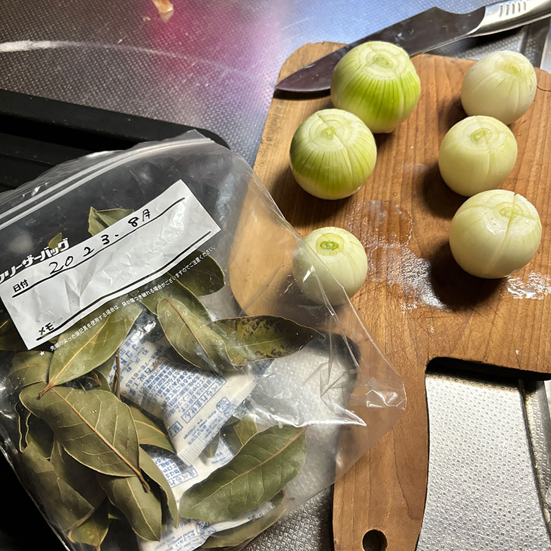 近所の方にいただいた小さな新玉ねぎに切り込みを入れて