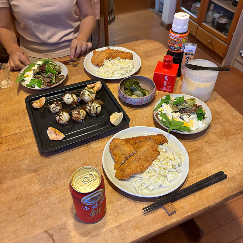 カミさんがアジフライ揚げてくれた。キャベツの千切りを添えるのはマスト。