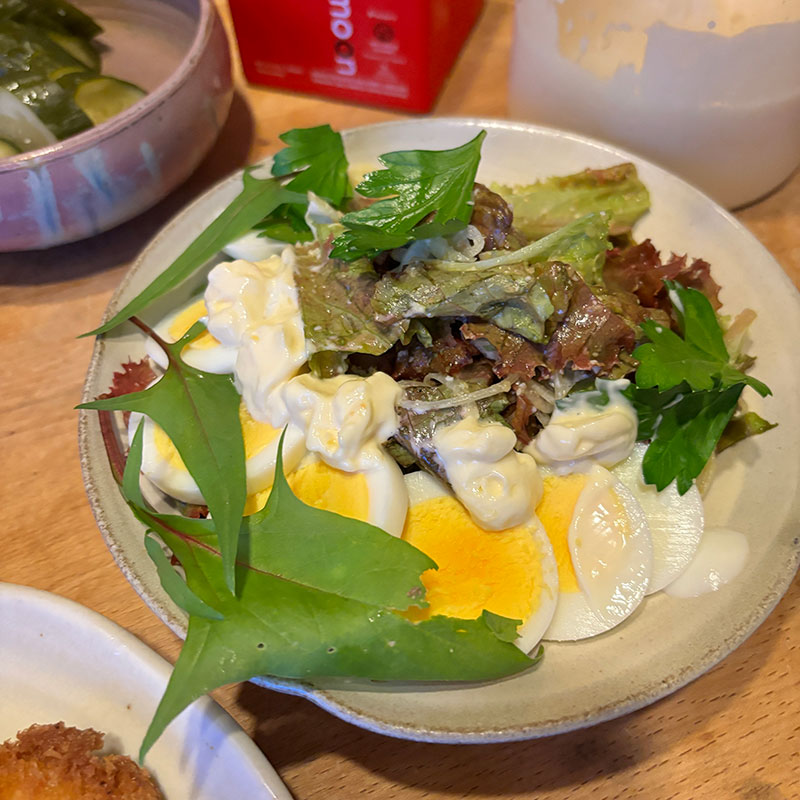 畑からペビーリーフ摘んできてゆで卵と自家製ドレッシングのサラダ。