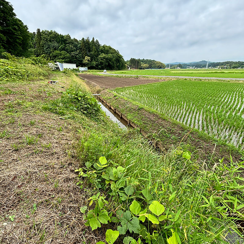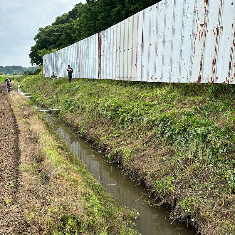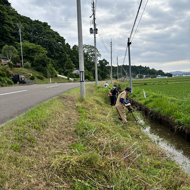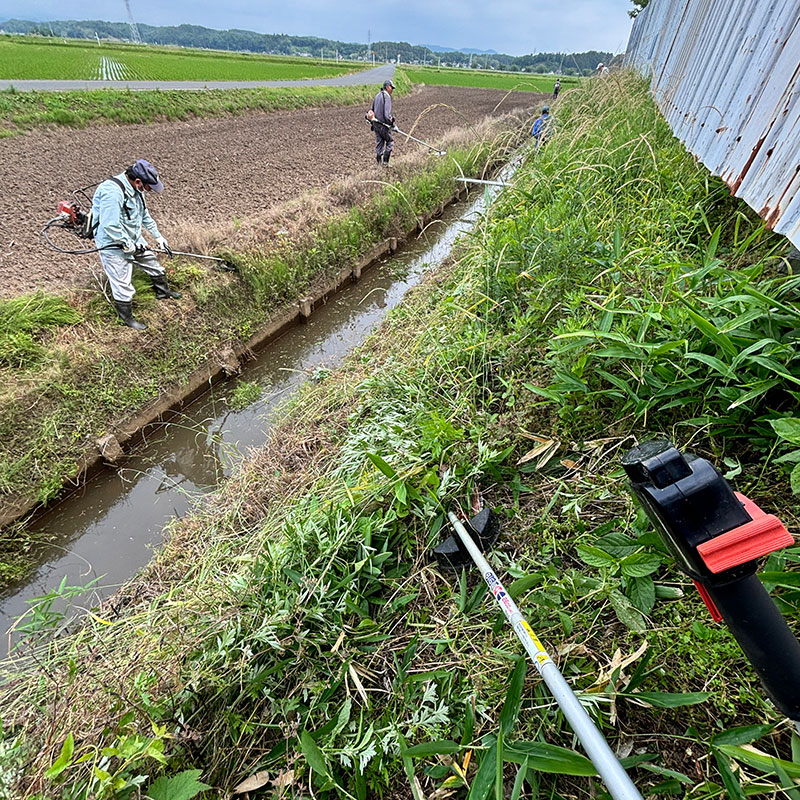 水路に滑り落ちないように踏ん張り、水路に刈った草を落とさないように刈り上げる。