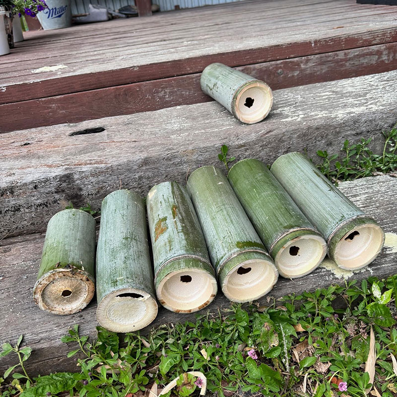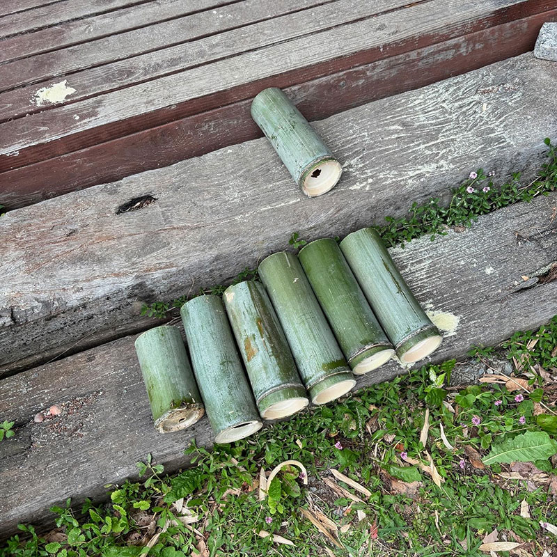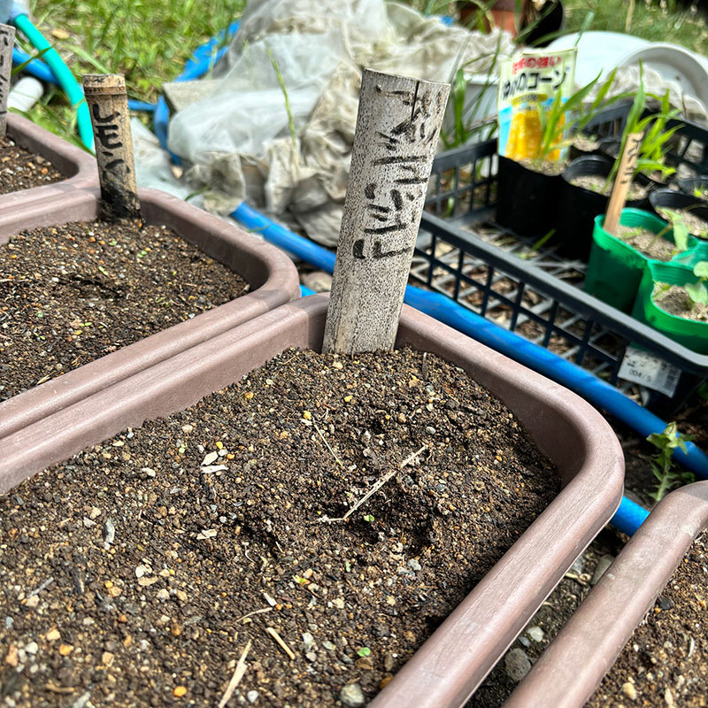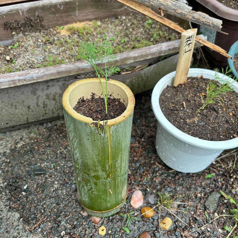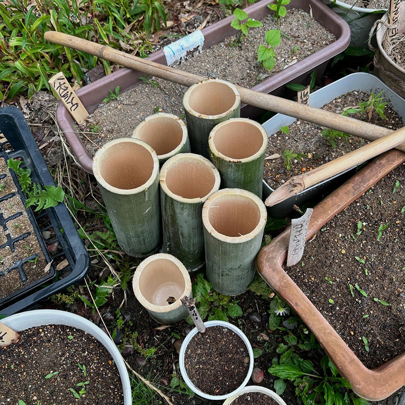 鉢もプランターも空きがないので太い竹を切って底に小さな穴を開けて