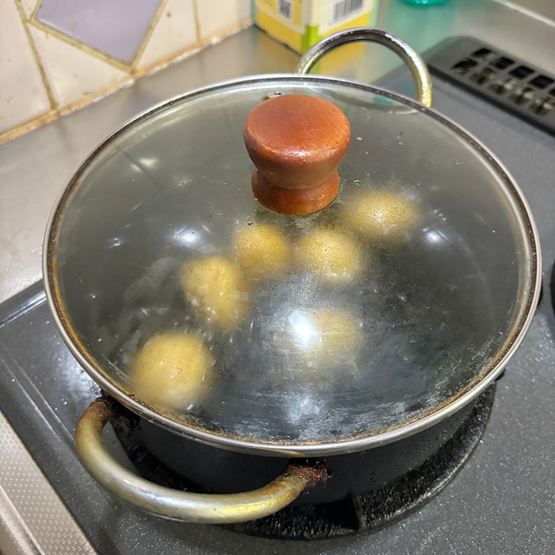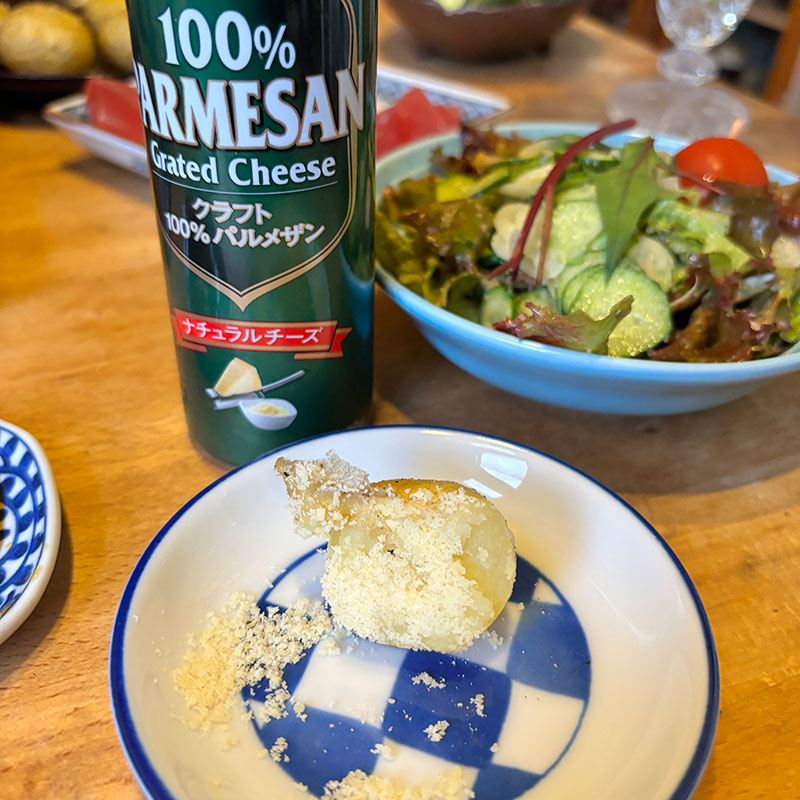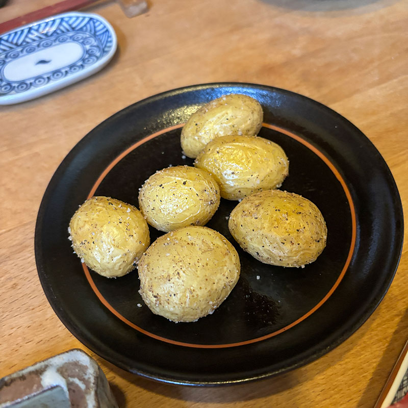 小さな新玉ねぎじゃないと作れない美味しい料理があるけど小さな新じゃがいもじゃなきゃ作れない美味しい料理もある。よく洗って水気をとった素揚げ。ただそれだけなんだけど僕の台所のバイブル、辰巳芳子さんの「旬を味わう」のレシピだと油にフタをする。最初は驚いた。なんとなく油で何かを揚げるときにフタをしたら危険と。だけどそのおかげで水気がじゃがいもに保たれる。皮付きだし。
