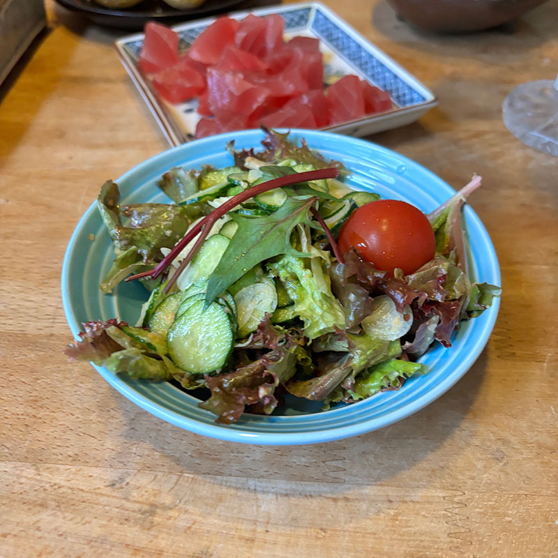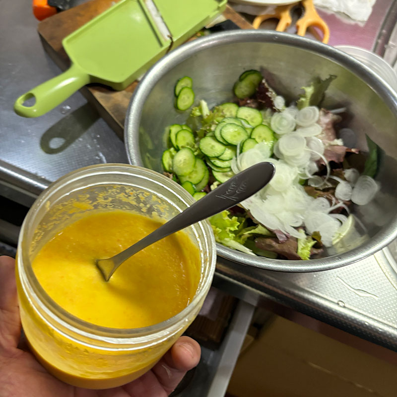 畑のペビーリーフと自家製にんたまドレッシングのサラダ。